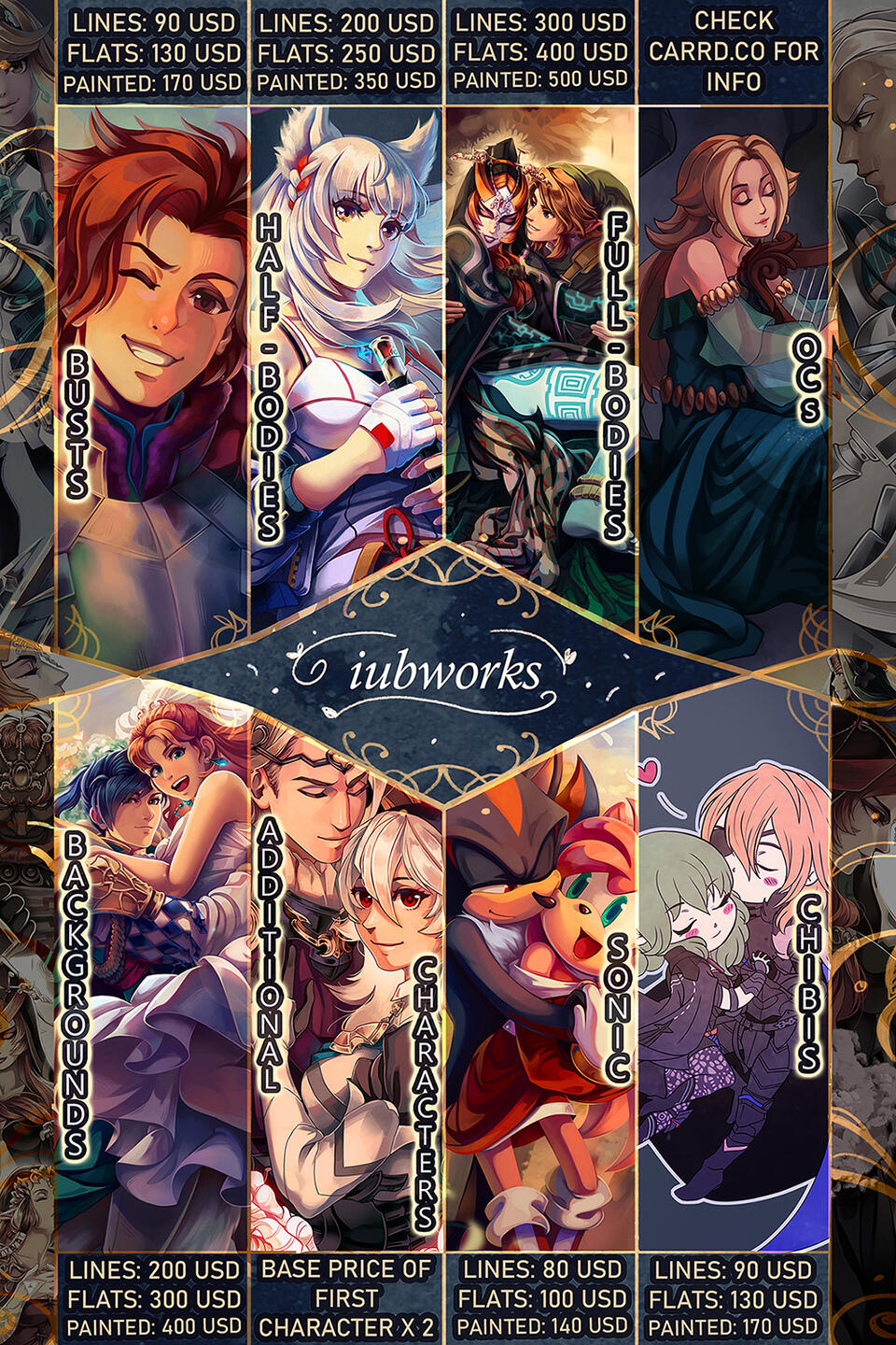 HELLO, AND WELCOME TO MY COMMISSIONS PAGE! PLEASE READ THESE RULES CAREFULLY BEFORE COMMISSIONING ME!IF YOU ARE A VOICE ACTOR, PLEASE READ THESE RULES AND THE RULES BELOW AS WELL IN THE SECTION DEDICATED TO YOU! THANK YOU SO MUCH!THANK YOU SO MUCH FOR REACHING OUT!—If you are commissioning fanart, your commission will be uploaded to my prints shop and Patreon. If you do not want this to happen then you must pay me an extra sum of money, since your commission could have netted me extra profit through INPRNT and my Patreon. The agreed upon price is an additional 100 USD.—Sometimes I will repurpose your commission’s pose/idea as personal art for myself using my own ships. No one is asking me to do this nor am I repurposing your commission for another client and cutting corners, this is ONLY personal art for me because I rarely have time to do personal art for myself. It’s just something for fun.—Similarly, I will not repurpose someone’s commission for someone else who also likes the idea and wants it for their own ship as that is unfair to the person who commissioned me for that piece/idea first. I’m not going to cut corners and take advantage of someone else asking for the same thing.—Commission prices are not set in stone. They change all the time, even if you’ve commissioned me for something similar in the past or if you’d asked earlier and the number suddenly changed. These factors contribute to the fluctuating prices: character designs, content, detail, my workload, my state of burnout, and how much time I think your piece is going to take me. Or I simply just forgot the first number I gave you. It’s hard to keep track of all the emails I get. ;-;—When I post your commission, I will not be @‘ing you in the post, but you’re free to comment on or quote the post and I will publicly thank you! This is because the algorithm hates when you put an @ in a post directly and because… well, my memory is godawful tbh. I can’t remember everyone’s @s, so if you want me to publicly shout you out in a reply to the post, please tell me. Sometimes years pass where I repost old art and usernames change. It’s nothing personal, it really isn’t. :’) The only exception to this rule is when I directly @ VAs so they can share with their followers the print that they’ll be signing and selling later.—If you want your commission posted sooner rather than later so that my patrons aren’t the only ones who get early access to the art you commissioned, I charge an extra 100 USD fee.—You can definitely hire me to draw your OCs! However, I charge extra for OCs. Where painted fan art characters are a flat rate of 500 USD, OCs are a flat rate of 650 USD. Prices also increase or change depending on if I'm adding a background, it's a painted piece, it's a bust, if I'm adding additional characters, if the OC is extremely detailed, etc.!—You are allowed two free edits before I begin charging 5 USD and up per edit depending on how complex the edit is. Big edits will forego this rule completely; I will charge accordingly depending on how big the edit is!—You may not redistribute or sell the commissioned piece anywhere. Reselling the art in any way shape or form is not allowed. You are not allowed to crop out the watermark, unless you are using the art for personal use such as icons. Expanding on this, I am allowed to sell the art on my shop, since the artwork is still mine. THIS RULE DOES NOT APPLY TO VOICE ACTORS!—I have a right to refuse commissions if I want to. Normally this only happens when my list is full and/or I’m burned out. Feel free to ask anyway!—To hire me, please reach me through [email protected].—I only accept full payment through PayPal upfront. I can do payment plans if you cannot afford the full price all at once!—I do not accept refunds. The only time I will refund is when your commission has not been started yet.CONCERNING SONIC ART COMMISSIONSThough the price sheet gives you the estimate for Lineart, Flats, and Paints concerning Sonic art, it does not give you the added estimate for whether you want your commission to be a full body, half body, or bust.To get an estimate, please DM me and we'll work something out!WILL DRAW:—Fanart